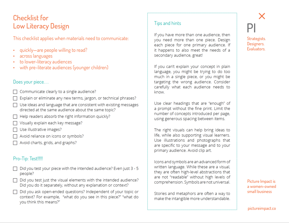 Are you developing materials to communicate to lower-literacy audiences? With young people (pre-literacy) audiences? Busy people who need to quickly absorb information? Across multiple languages? This checklist is for you! Make sure your materials can be easily used by the people you intend.